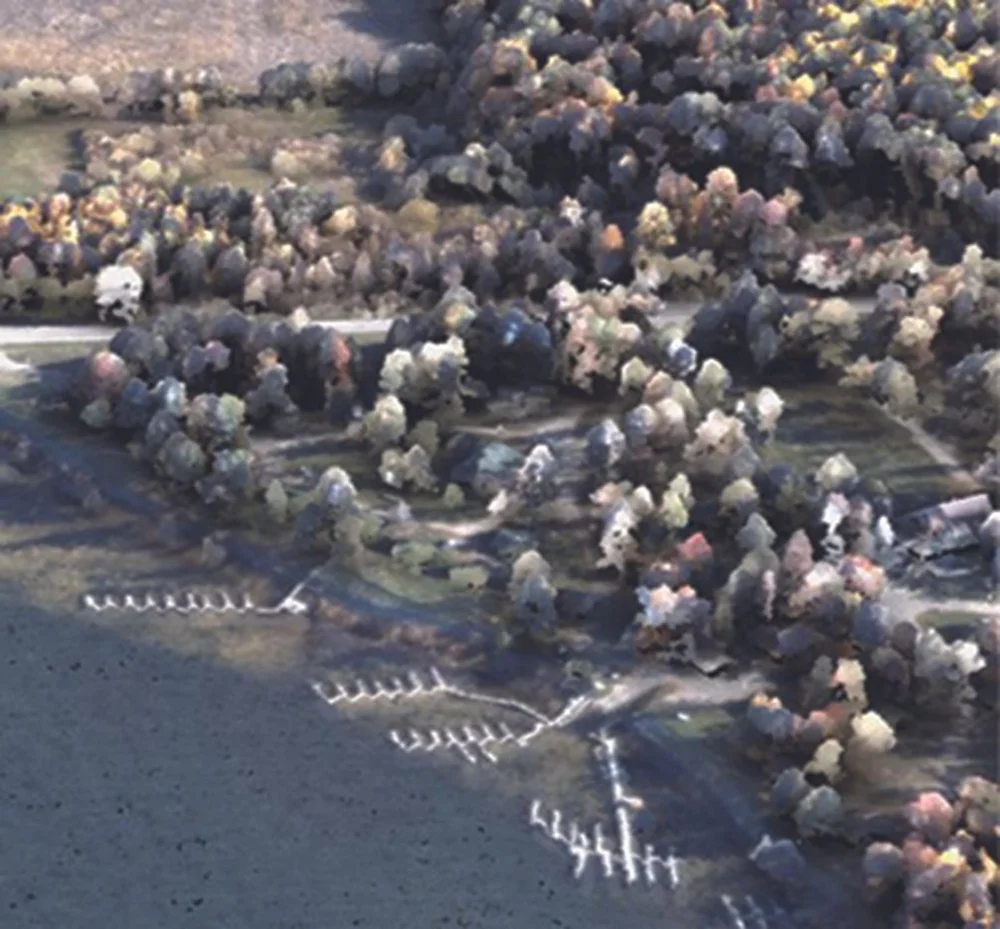 For example, a lidar camera in an airplane can scan across the landscape providing a detailed representation of the ground and everything above it. In a forest, the laser pulses hit treetops, travel through canopy gaps, sometimes hitting the ground or scattering. The reflected laser pulses return to the sensor, providing a cloud of points mapping the position and elevation of things on the Earth’s surface.