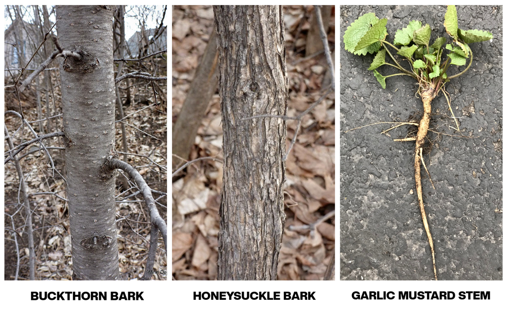 All three of these species can be spotted most easily, as mentioned above, by the presence of bright green leaves still hanging on during times when most native vegetation has gone dormant. Non-Native Honeysuckle can also be identified by breaking open a twig or branch and observing a brown center or pith – this is different from native Honeysuckle because natives will include a white or natural-colored pith. You can also “look under the hood” of the Buckthorn plant by scraping its bark to reveal orange cambium, which helps identify it against potential native look-alikes which will have green cambium.